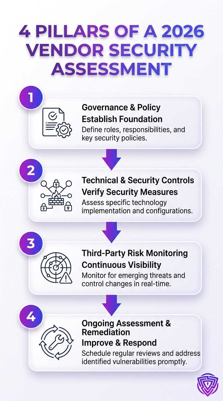Explore the four essential pillars of a robust Vendor Security Assessment for 2026. This infographic highlights the criteria to evaluate when vetting third-party vendors.